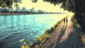 プロンプト:ワードクラウド、ゼンタングル、黒髪ロングでポニーテールの女の子が横向きに歩いている、都会の路地