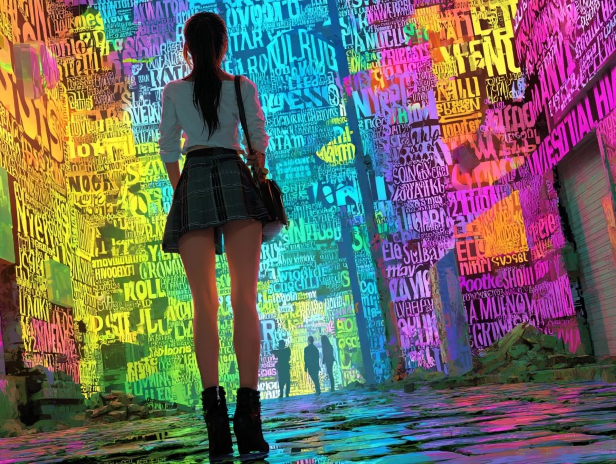 プロンプト:ネオンカラーのワードクラウド、二重露光、ハイコントラスト、フォトリアル、黒髪ロングでポニーテールの女の子が横向きに歩いている、都会の路地