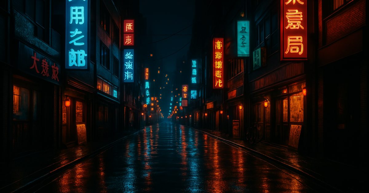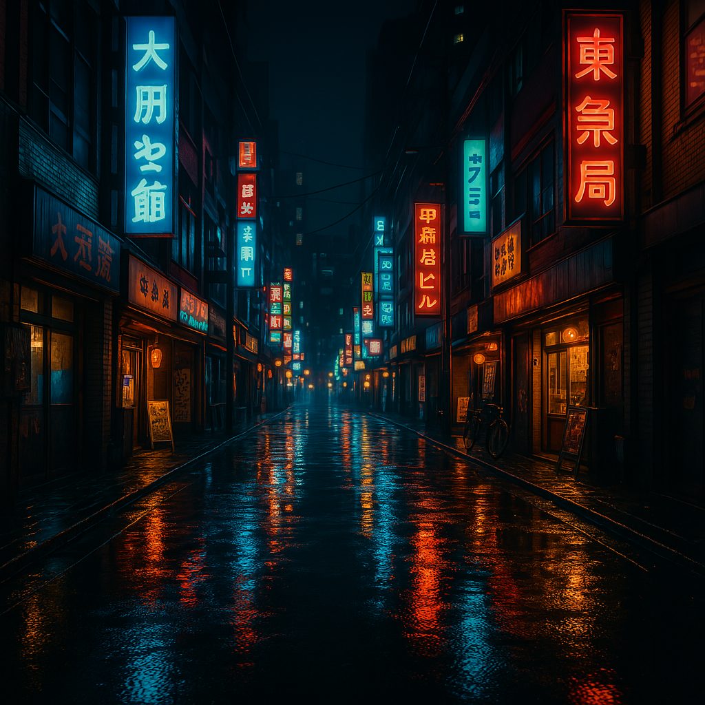 日本語プロンプト:東京のネオン街、夜、路面が濡れていてネオンが反射している。ローアングルのリアルな街の風景、映画のワンシーンのような雰囲気。