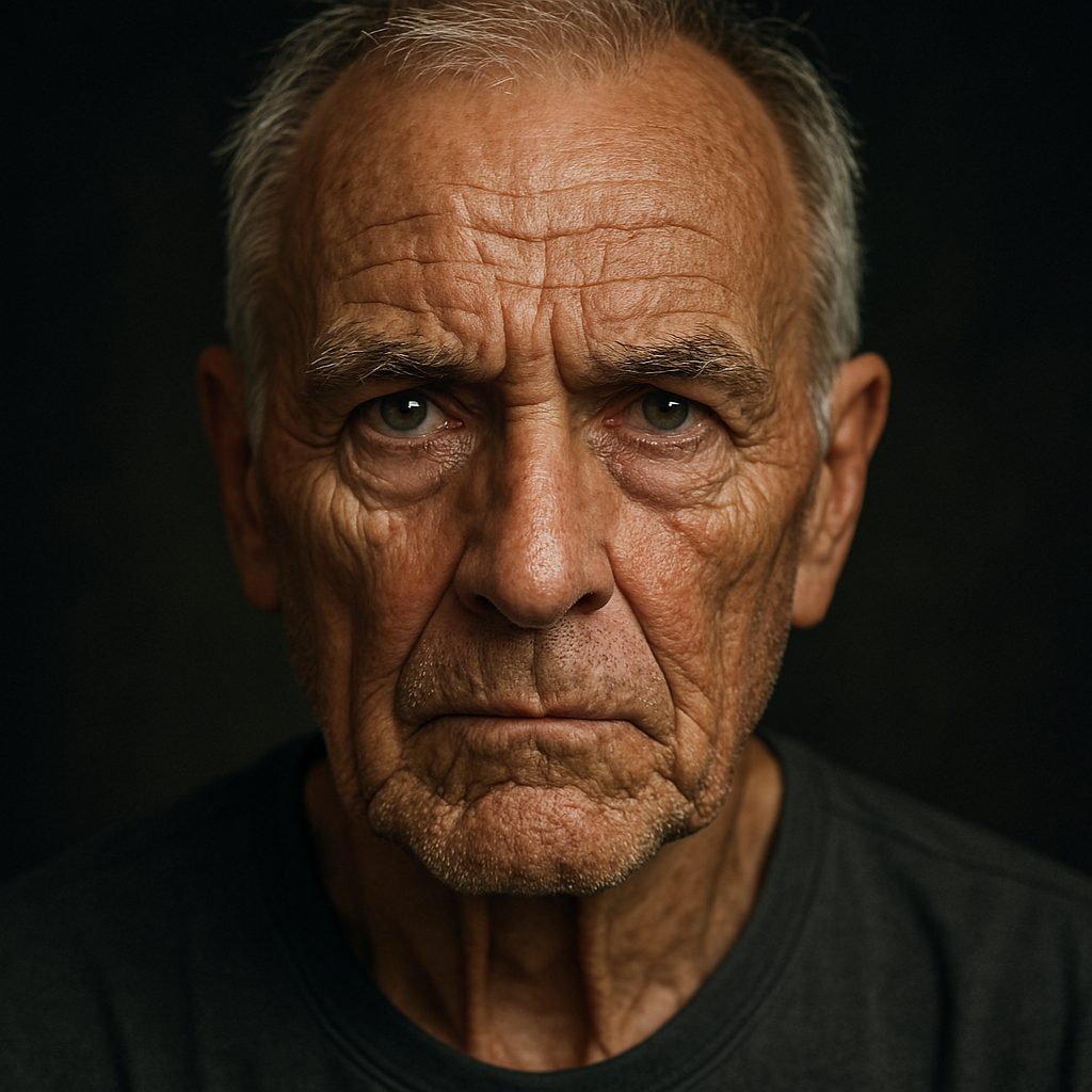 English Prompt: A hyper-realistic close-up portrait of a person with deep facial features and expressive eyes. Studio lighting from the front, lifelike skin texture, extremely detailed, neutral background.