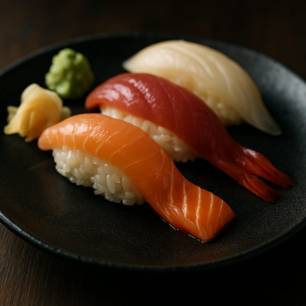 English Prompt: A photorealistic macro shot of a sushi set on a black ceramic plate. Glossy fish texture, individually detailed rice grains, with wasabi and pickled ginger, captured in soft natural light.