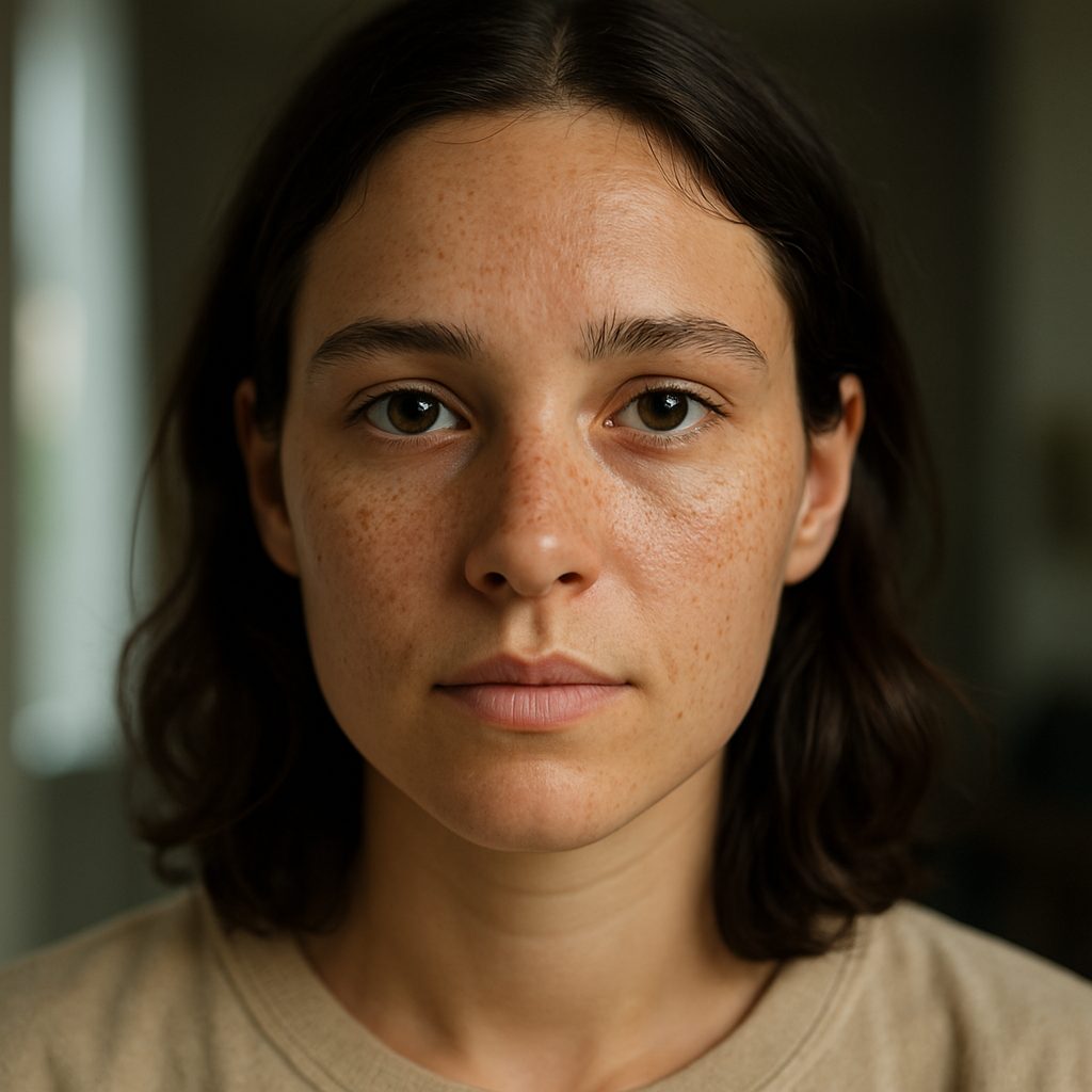English Prompt: A photorealistic portrait of a person with a natural expression, captured in soft daylight. Shallow depth of field, blurred background, 85mm lens perspective. Fine skin texture visible, ultra high resolution, cinematic lighting.