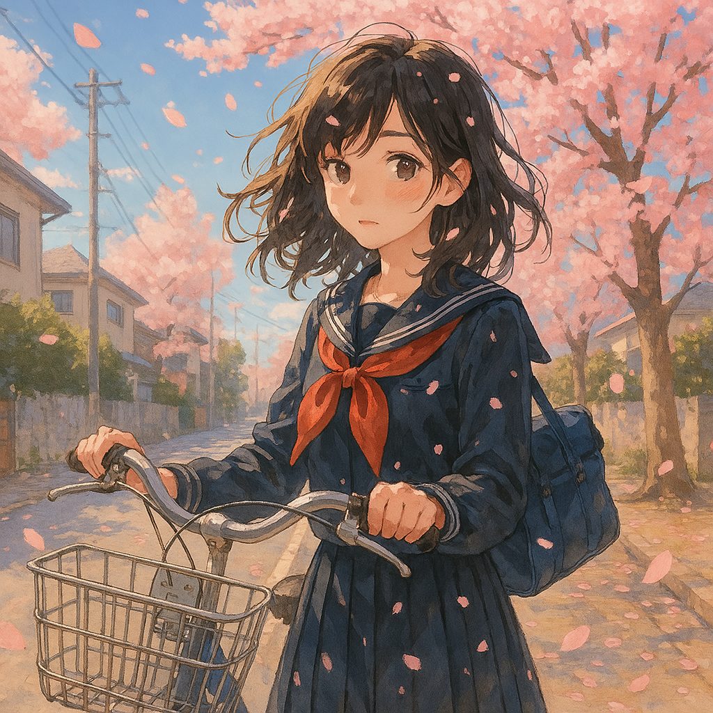 桜吹雪と自転車通学というテーマは、 単なる美しい風景ではなく、”記憶”や”感情”までも描くことができる題材です。