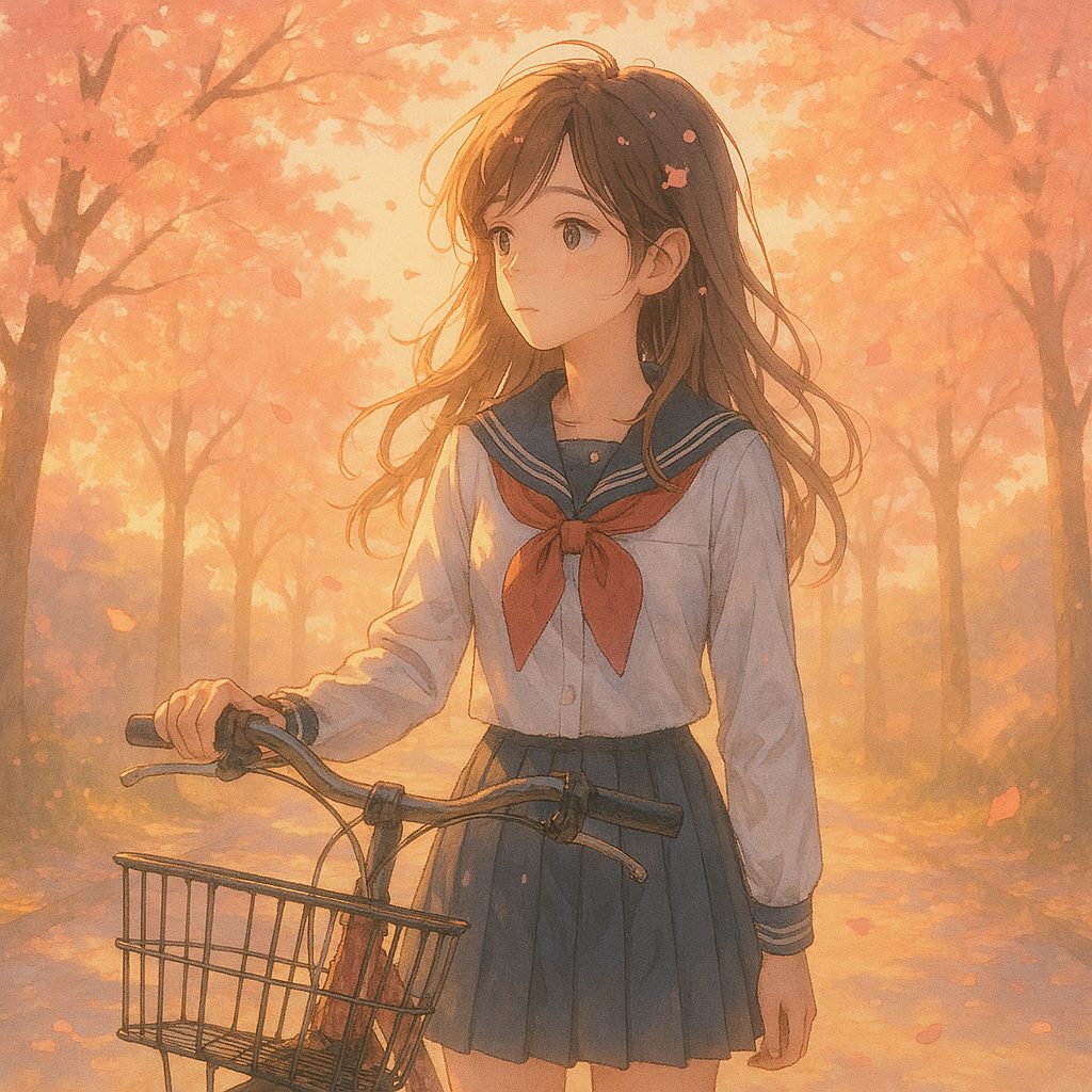 日本語①: 春の通学路で制服姿の少女が自転車を押しながら立ち止まる。 桜の花びらが風に舞い、制服と髪に降りかかる。 静かな朝、もしくは放課後のやさしい光の中で、物思いにふける瞬間。